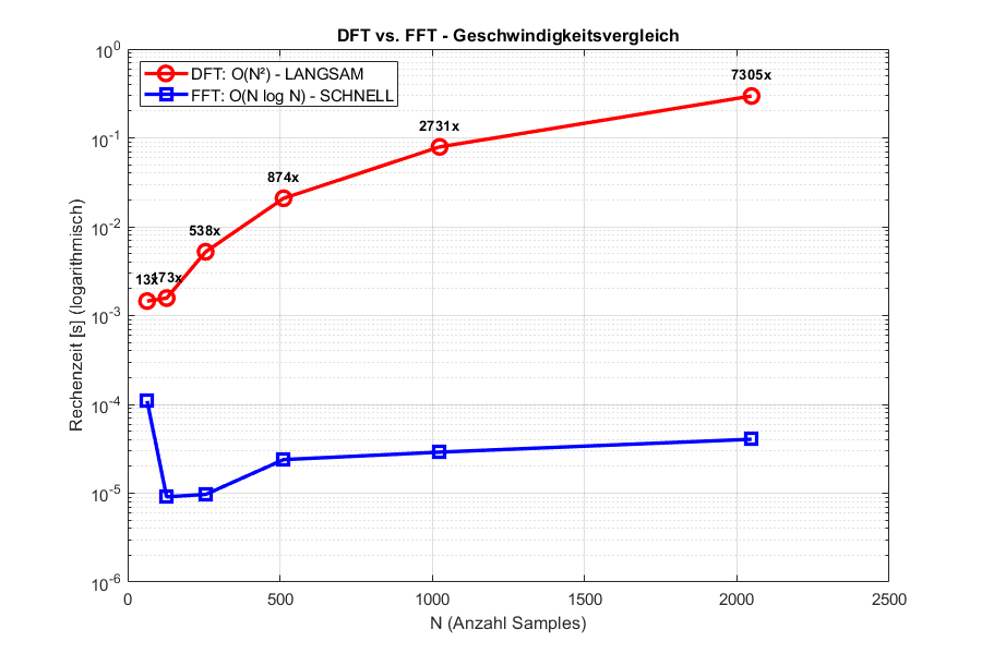 Die FFT ist mit O(n log n) deutlich effizienter als die direkte DFT-Berechnung mit O(n²):
