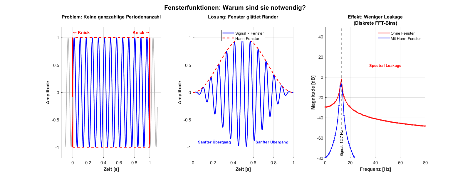 Um dies zu vermeiden, verwendet man Fensterfunktionen, die das Signal an den Rändern sanft auf Null abklingen lassen.