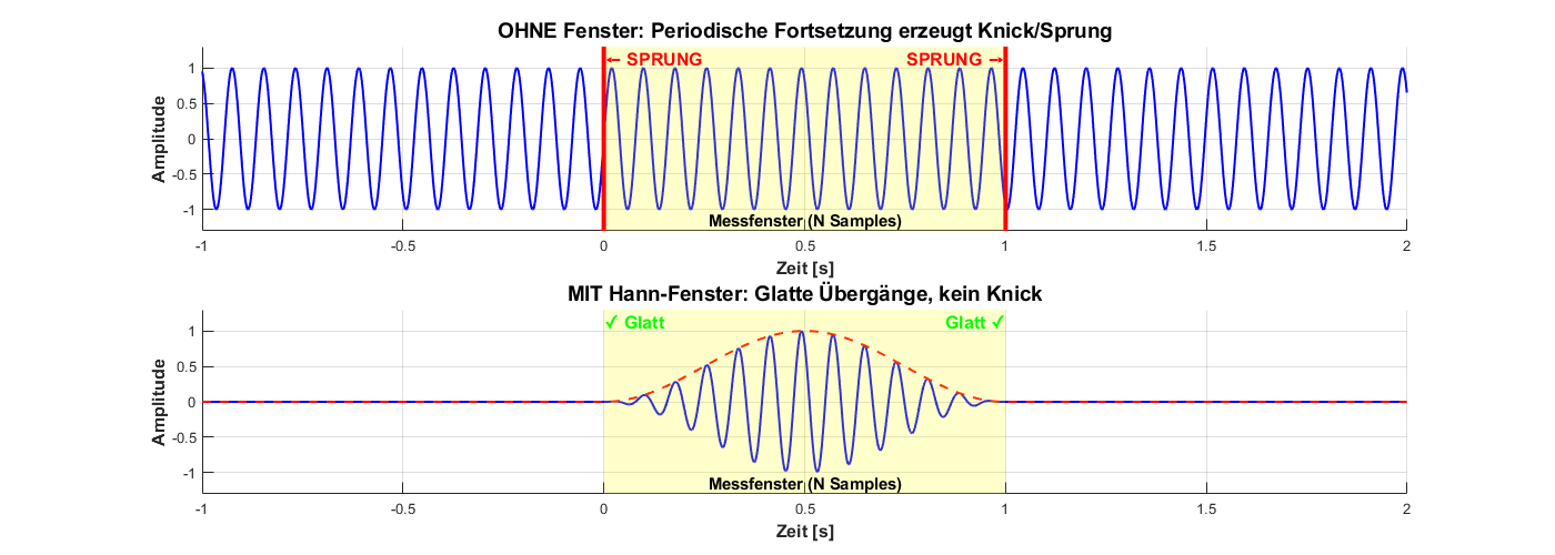 Die FFT geht davon aus, dass das Signal periodisch ist - also dass sich das analysierte Stück unendlich oft wiederholt. Wenn das Signal jedoch nicht genau eine ganzzahlige Anzahl von Perioden enthält, entstehen an den Übergängen Sprungstellen, die zu Spectral Leakage (Frequenzverschmierung) führen.