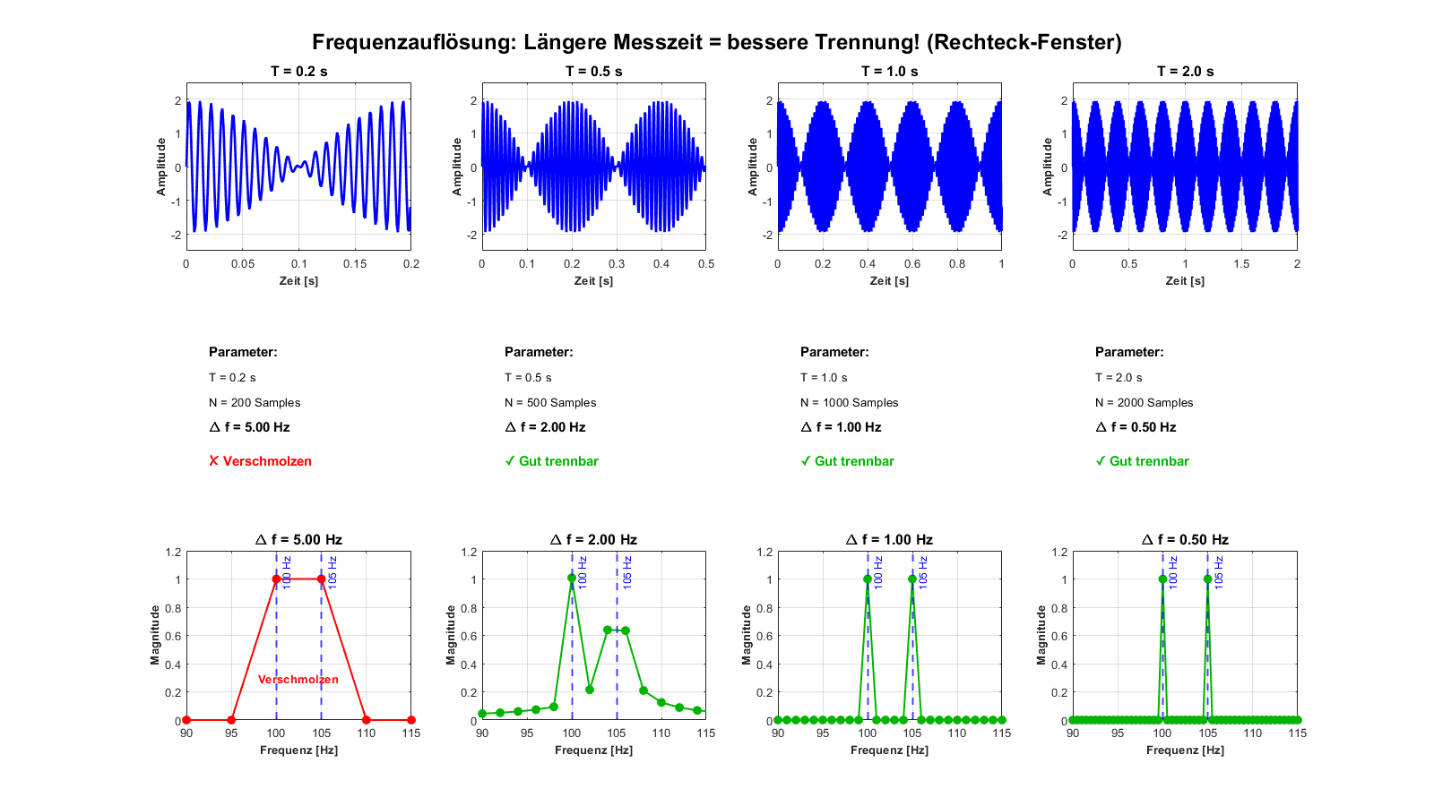 - Sauber: \(\Delta f \leq 0.5\) Hz → \(T \geq 2\) s