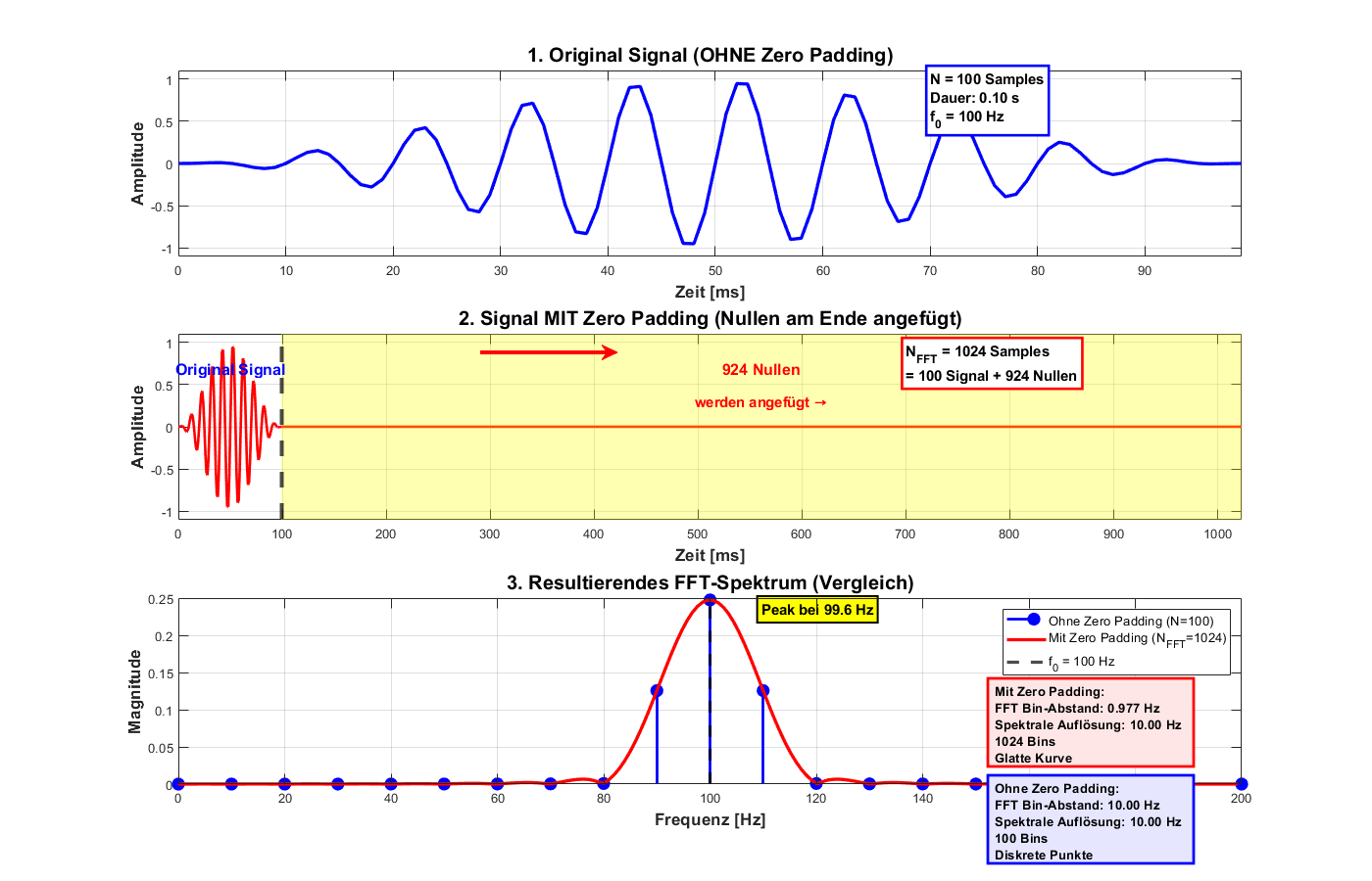 Zero-Padding ist nützlich für schönere Spektrum-Plots, ersetzt aber keine längere Messung.