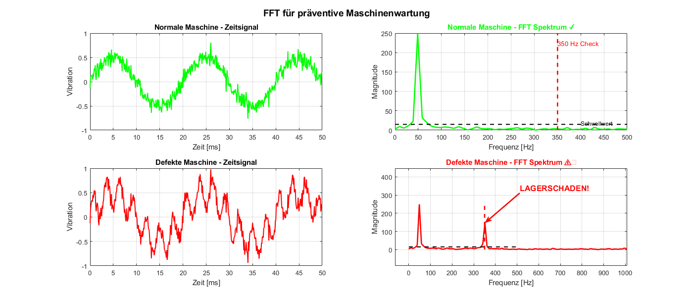 - Abweichungen im Spektrum zeigen Defekte (z.B. Lagerschaden bei Maschinen)
