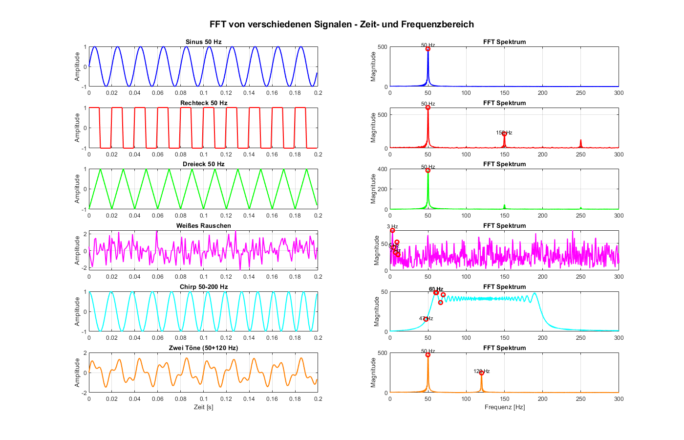 Frequenzbereich (Frequency Domain): - Zeigt, welche Frequenzen im Signal enthalten sind - X-Achse: Frequenz [Hz] - Y-Achse: Magnitude (Amplitude der jeweiligen Frequenz) - Zeigt die "Zusammensetzung" des Signals